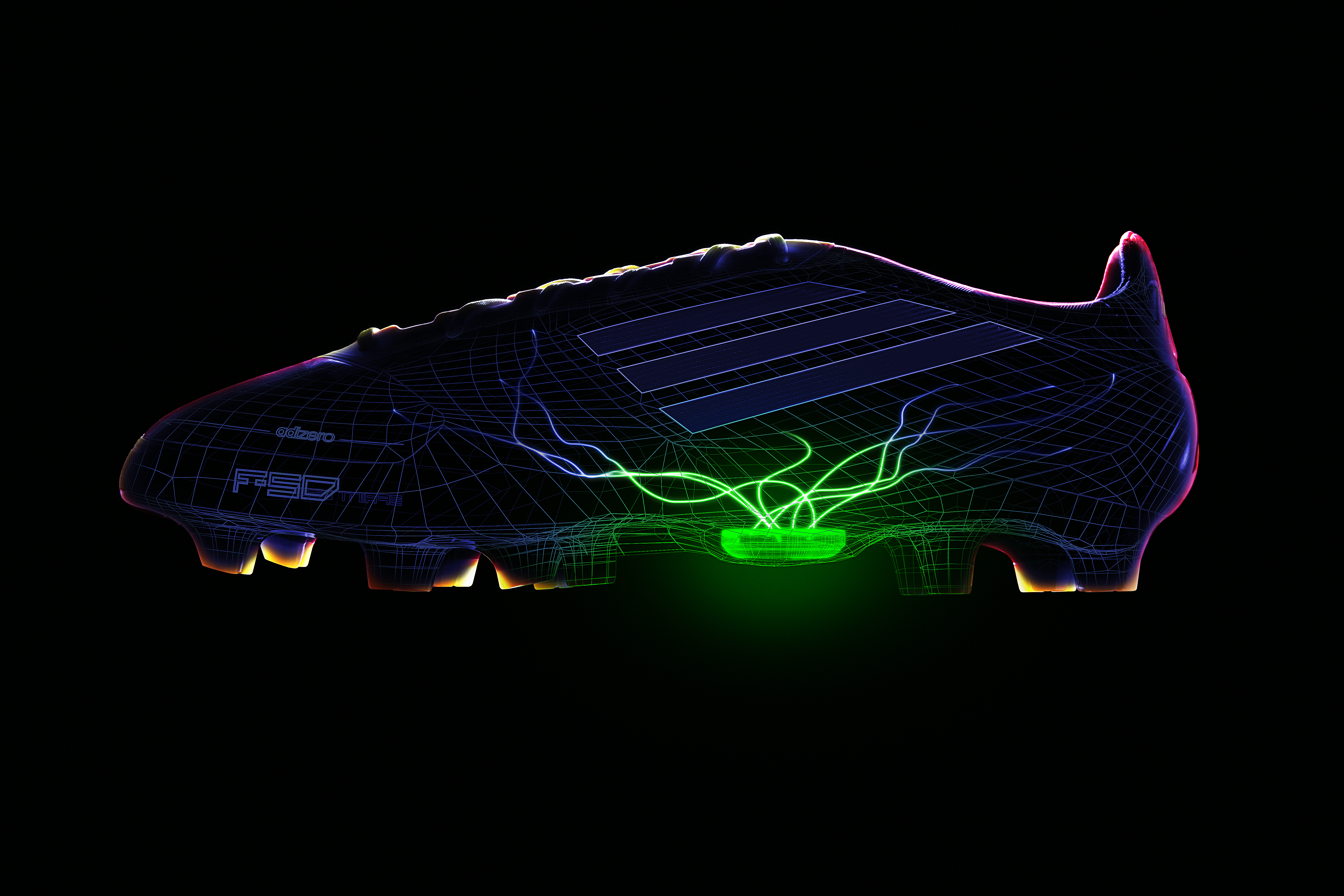 The makeup of the adidas F50 adiZero miCoach football boots revolves around three main structures: Sprintskin, Sprintframe and the newly added Sprintweb.