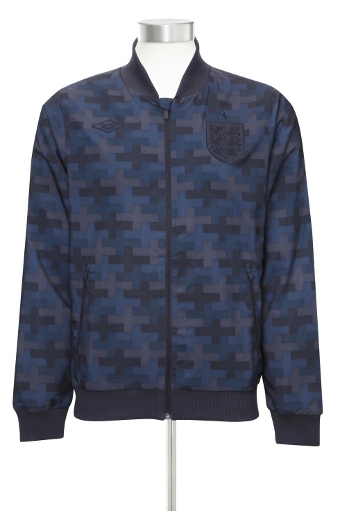 The new print design features subtly on the pop out collar of the special edition England shirt and covers the Anthem Jacket in a tonal navy St Georges Cross print.