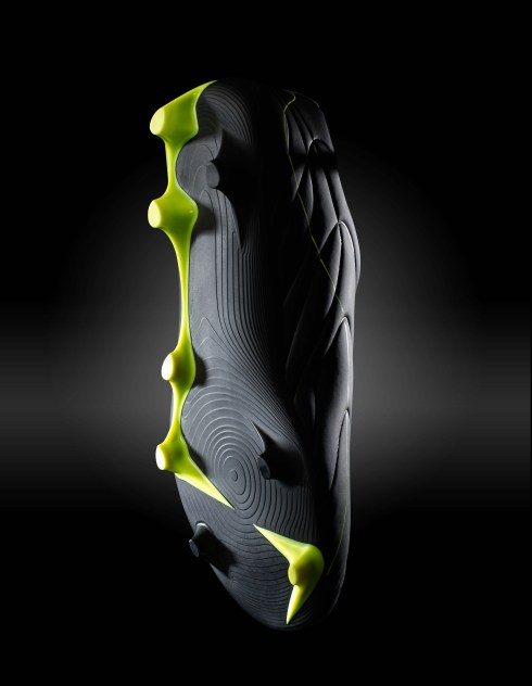 Quite different from most boots designed today who offer a symmetrical stud solution even though the natural movement of the foot is asymmetrical. The extreme position of the rear tripod studs trigger earlier ground contact and stability with high velocity release and the forefoot studs permit excellent traction and explosive acceleration.