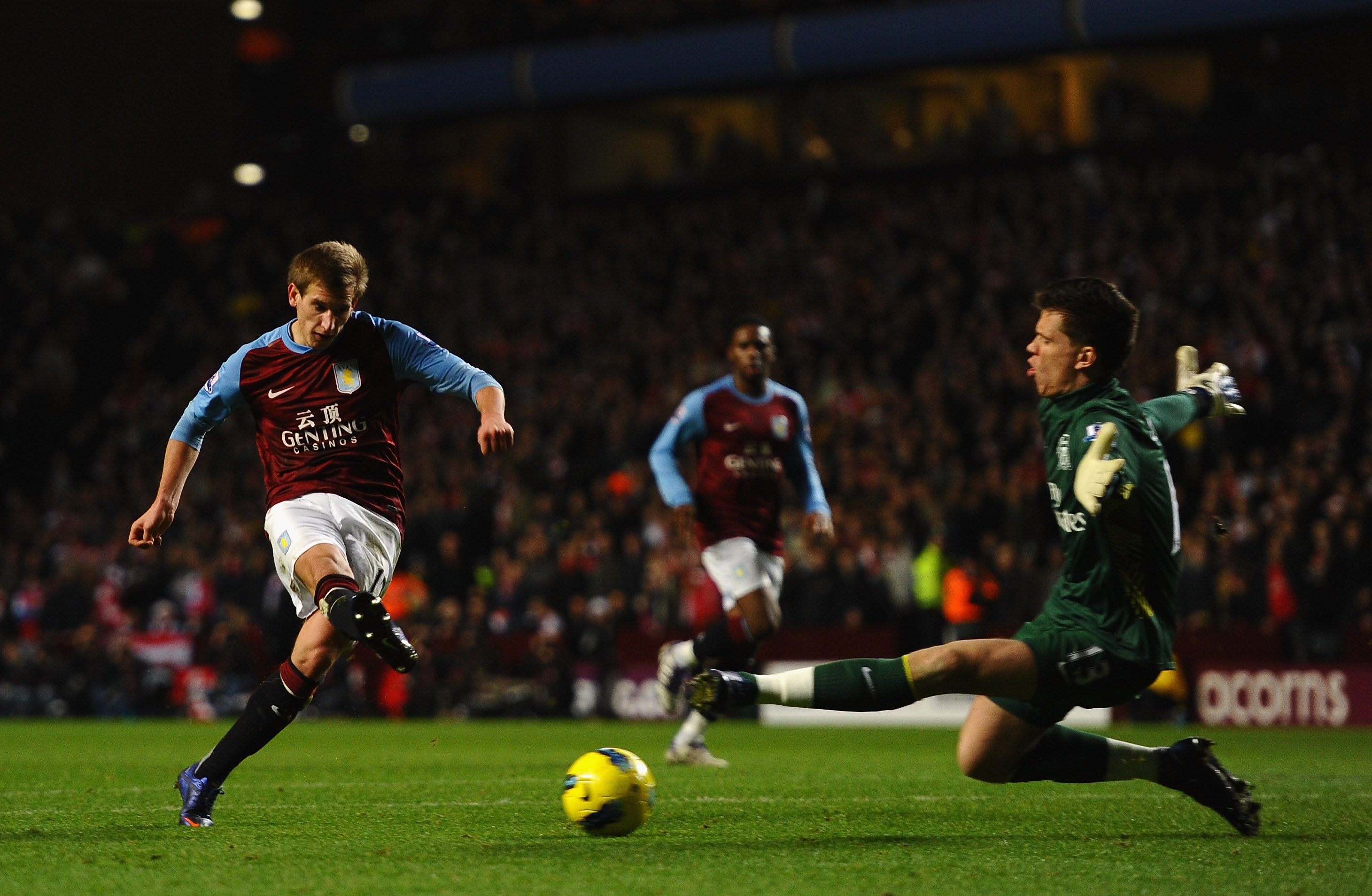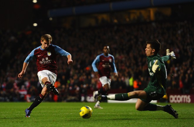 The Villa winger, wearing Nike CTR 360 Maestri II’s, slipped the ball past Arsenal’s Wojciech Szczesney in the 54th minute to score the landmark goal.