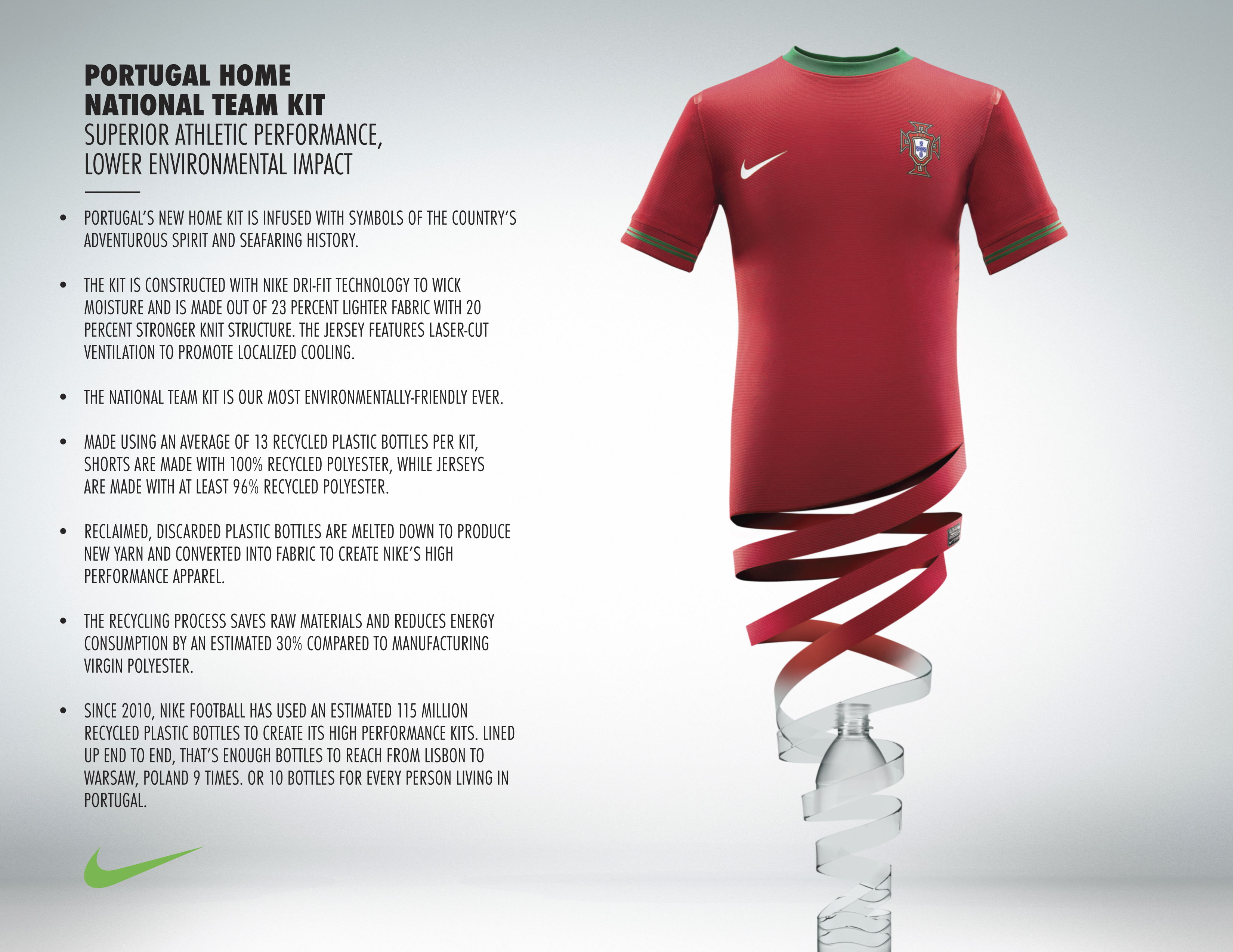 Yes, you did read that right: since 2010, Nike football has used an estimated 115 million recycled plastic bottles to create its high performance kits which lined up end to end, would reach from Lisbon to Warsaw an astonishing nine times over! Or put differently, ten bottles for every person living in Portugal!