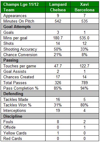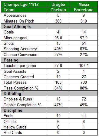 Nevertheless, despite playing less than half the minutes that Messi has in the Champions League, Drogba matches Messi for chance conversion (27%), creating two goals and a respectable ten chances for his teammates. Barcelona will need to be wary of the less celebrated but often devastatingly direct approach of Drogba and his Chelsea teammates.