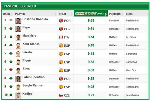 According to Castrol EDGE Performance research, Portuguese hardman Pepe has been a key element in his team’s march to the last four, netting Portugal’s first goal of UEFA EURO 2012™ (v Denmark) and creating four goal-scoring chances for team-mates.