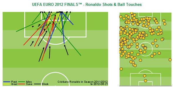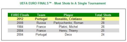 Ronaldo’s record-breaking haul of 30 shots so far includes three goals, which also makes him the joint top-scorer at UEFA EURO 2012™ so far.