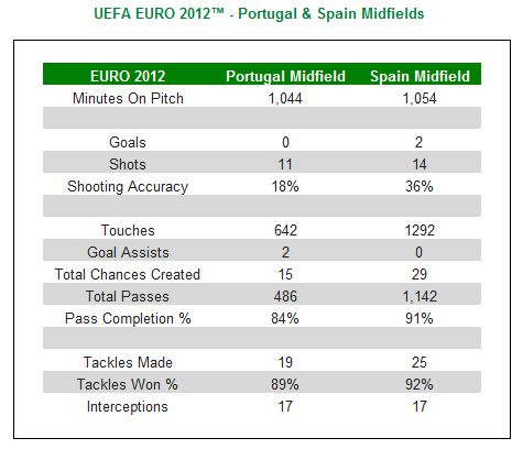 In the first of the semi-finals, the current World and European Champions face their Iberian neighbours, Portugal, a team who have a gifted midfield trio themselves, in the shape of Raul Meireles, Joao Moutinho and Miguel Veloso. However, so far, the Spanish engine room has been far more impressive. Indeed, as well as scoring more goals (both courtesy of Xabi Alonso vs. France) and mustering more shots, the Spanish trio have also made over twice as many ball touches and passes as their Portuguese rivals, as well as posting a superior passing accuracy rate.