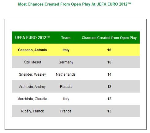 So far in UEFA EURO 2012™, Cassano has created 16 goal-scoring chances for teammates from open play, the joint-highest figure so far, as he blossoms in second-striker role for the Azzurri.