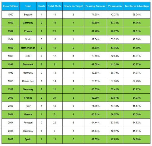 Possession is therefore a poor indicator of success and Spain will need to turn passes into goal scoring opportunities if they are to succeed on Sunday night. Since 1980, the team with more shots has won six out of eight European championships.