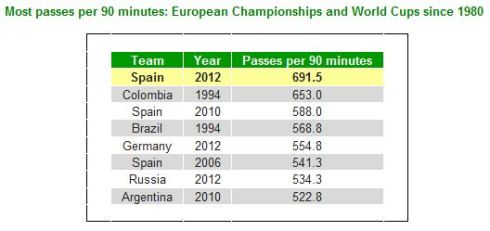 At Euro 2012 so far, Spain have attempted nearly 700 passes per 90 minutes, over 100 more than any other side at the tournament, highlighting their domination of the ball. This total is also significantly more than any other side has managed at either a European Championships or a World Cup since 1980:
