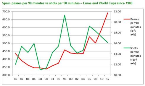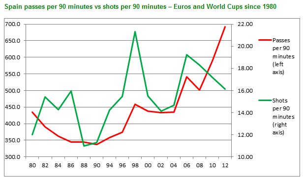 The Spaniards have made a dramatic improvement on their performance from the 2010 World Cup, making over 100 passes more per 90 minutes so far. However this has not resulted in an improved number of shots. In fact, the number of shots Spain have made per 90 minutes has dropped in each of the last three major tournaments since the 2006 World Cup: