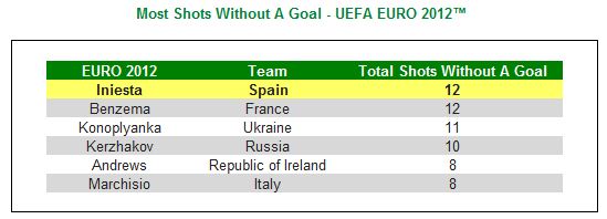 Andres Iniesta’s failure to find the net at EURO 2012 so far is a prime example of Spain’s struggle to make the most of their possession. Indeed, no player has mustered more shots during the tournament without scoring, a record the Barcelona schemer will no doubt be hoping to consign to the dustbin against Italy in the final.