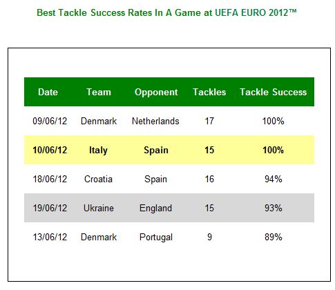 Only one other team in the whole of UEFA EURO 2012™ has managed to win every single one of their tackles in a game (Denmark v Netherlands) and this desire to win the ball minimised the time and space the likes of Xavi and Andres Iniesta had on the ball.