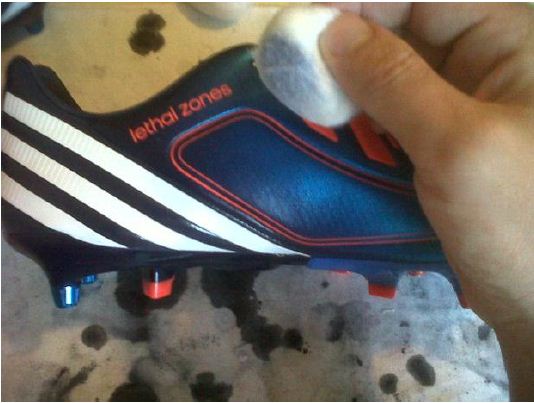Using the cotton pad, you then gently apply a light, even layer of surface finisher onto the boot.