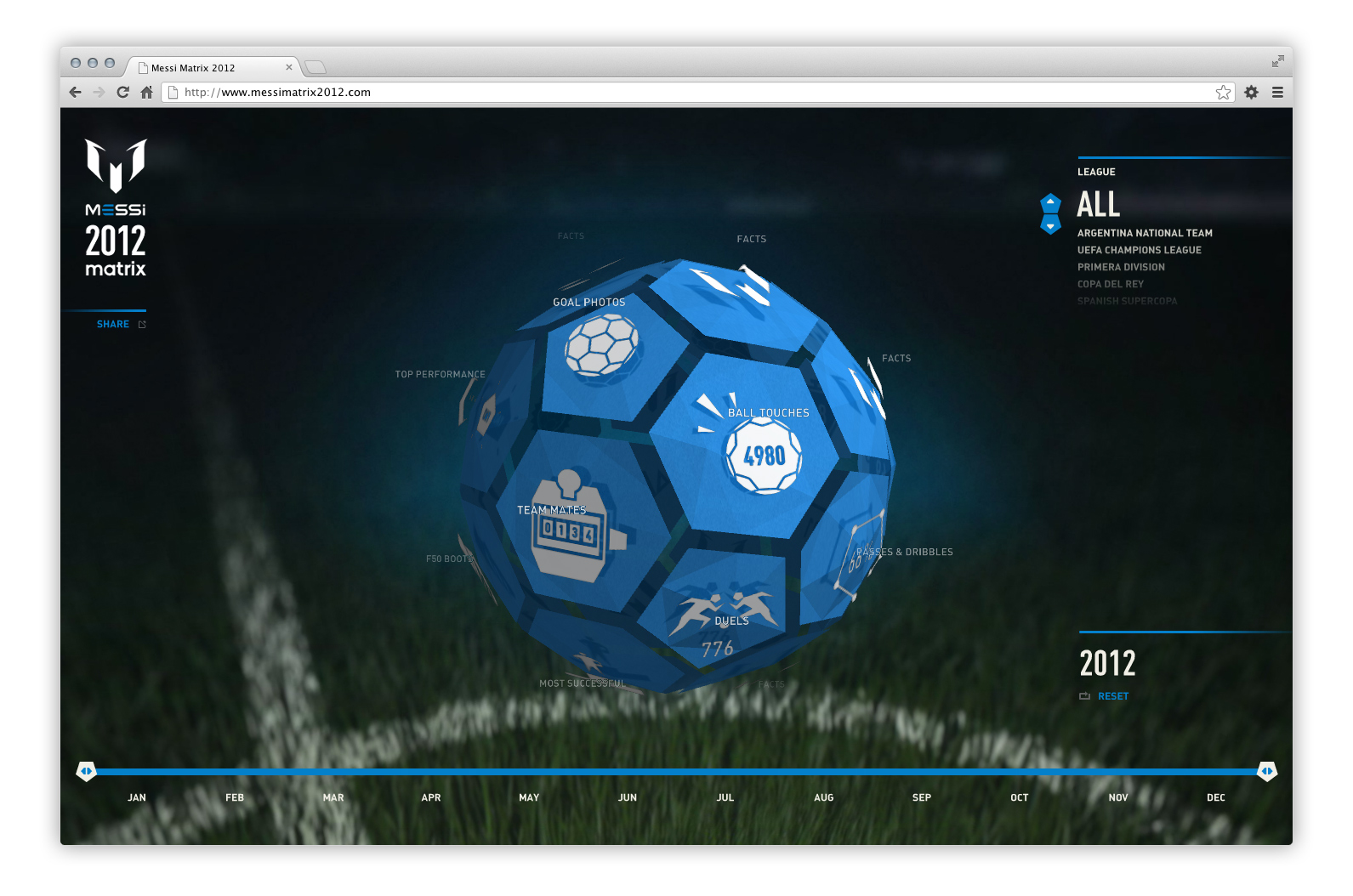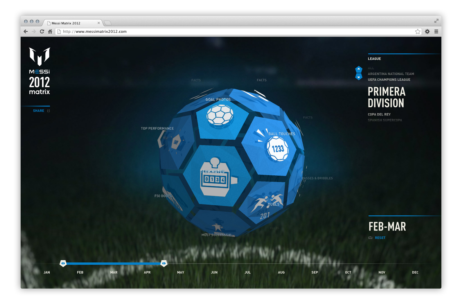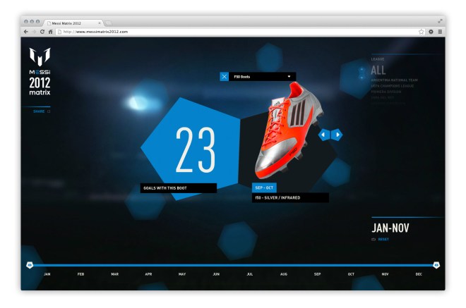 To celebrate Messi’s record breaking 2012, adidas has launched the ‘Messi Matrix’ – a web app that enables fans to celebrate and explore the record-breaking year of the world’s greatest footballer in a fast and fun way.