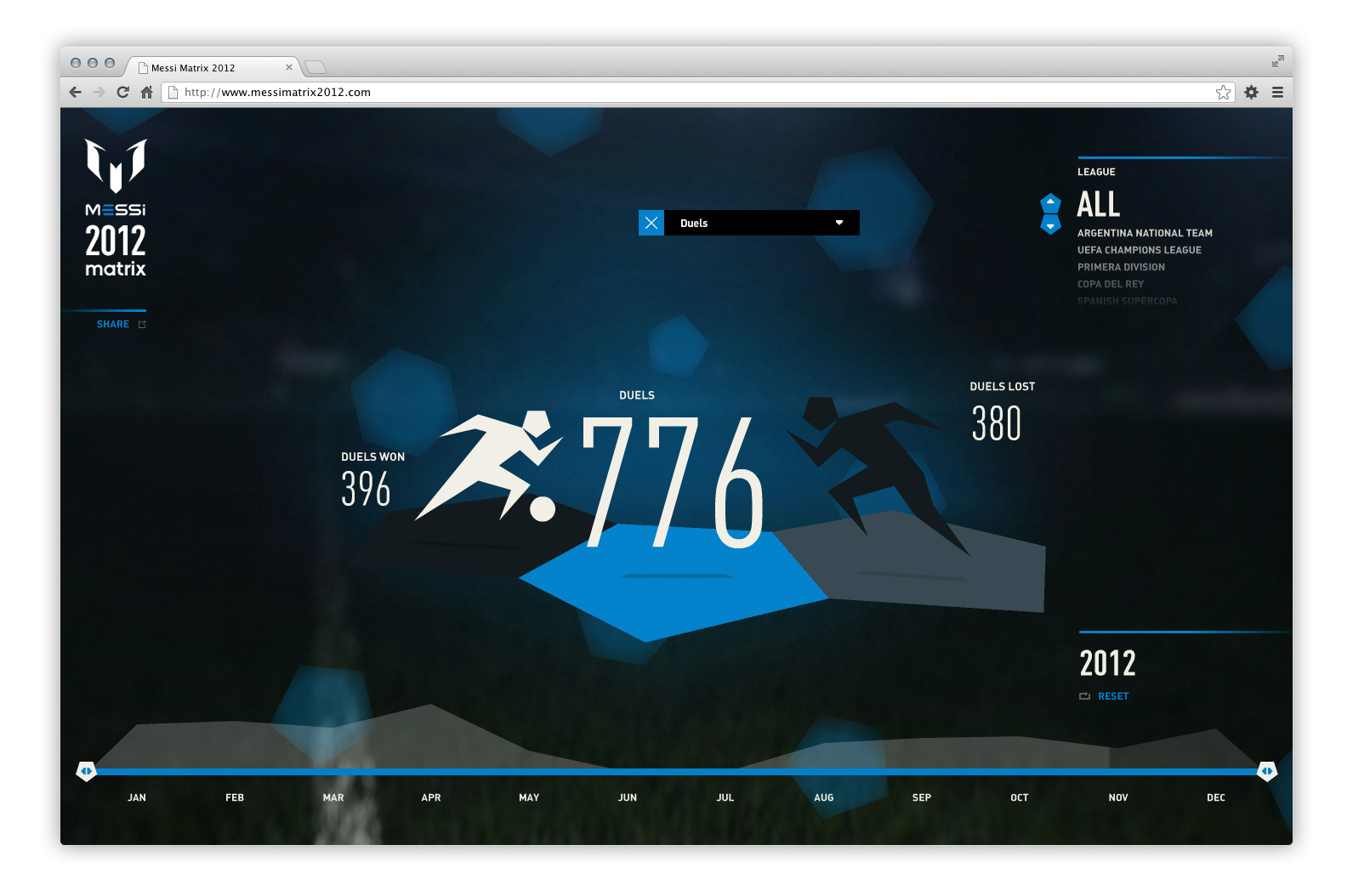 Messi Matrix 2012 celebrates Leo Messi’s year by visually documenting and calculating the stats his fans will love, such as performance by time in matches, top five stadiums played in, or the fact Leo achieved a 67% pass completion.