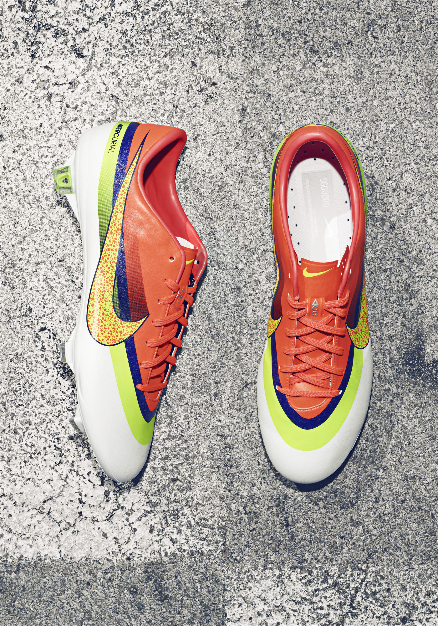 The signature CR Mercurial Vapor IX boot has been reworked with this season’s version a fusion of white, neon orange, with a neon yellow and orange safari print inspired by the safari print that was first seen on a Cristiano Ronaldo product in HO10 on the Mercurial Vapor Superfly II.