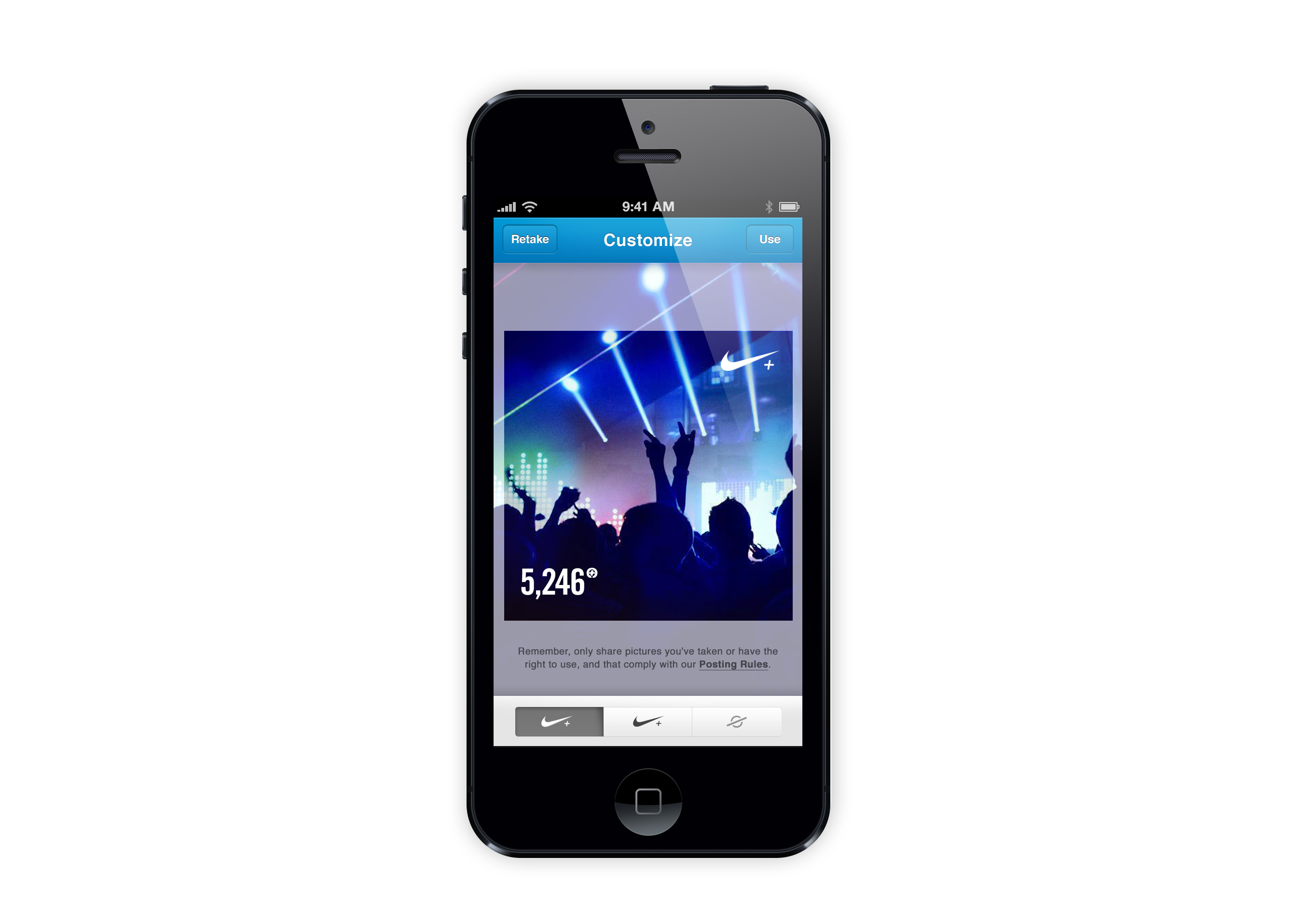 Users can also customize their photo with an overlay that includes their current NikeFuel score and the Nike+ logo before sharing images with their Facebook communities.
