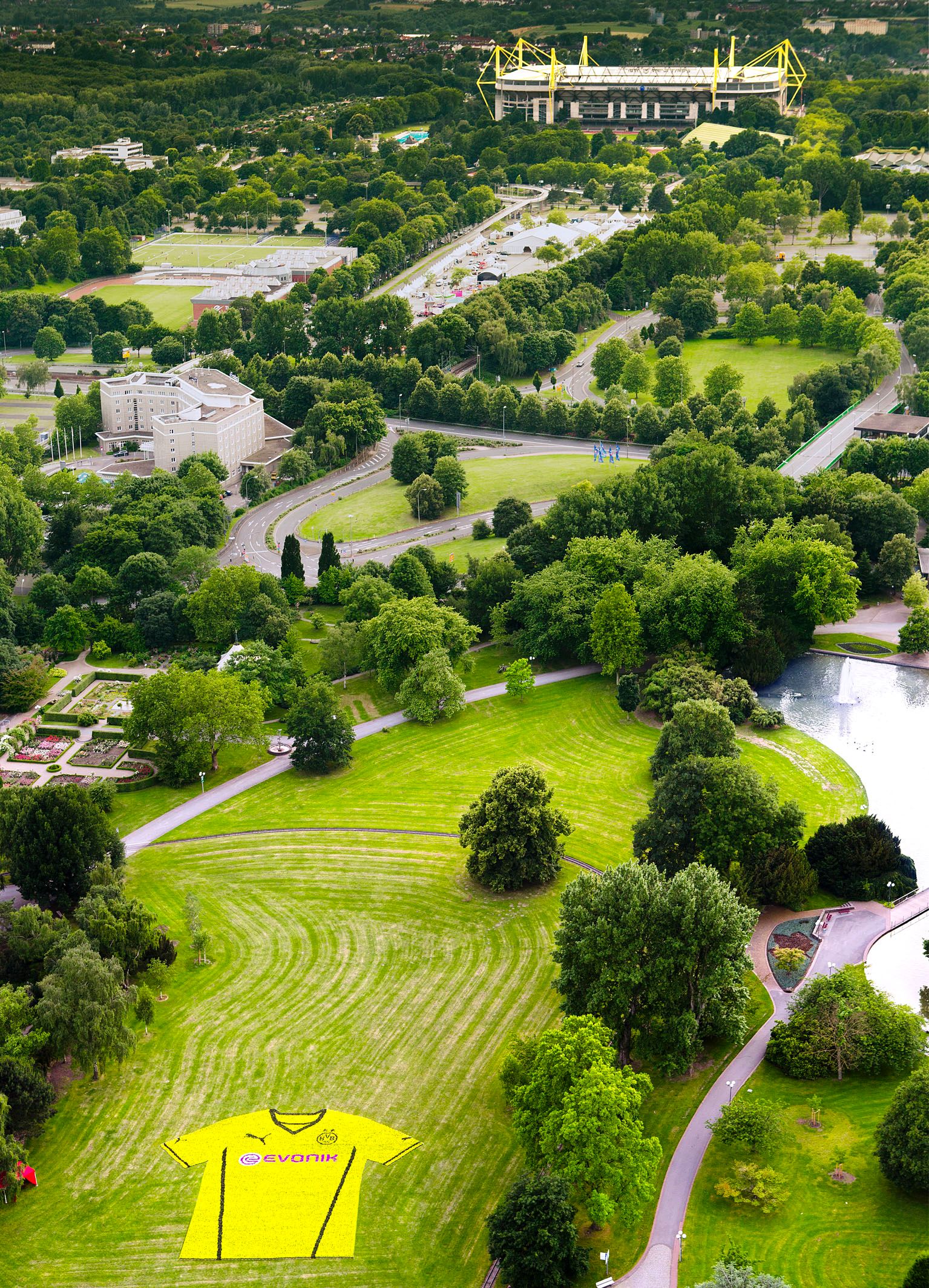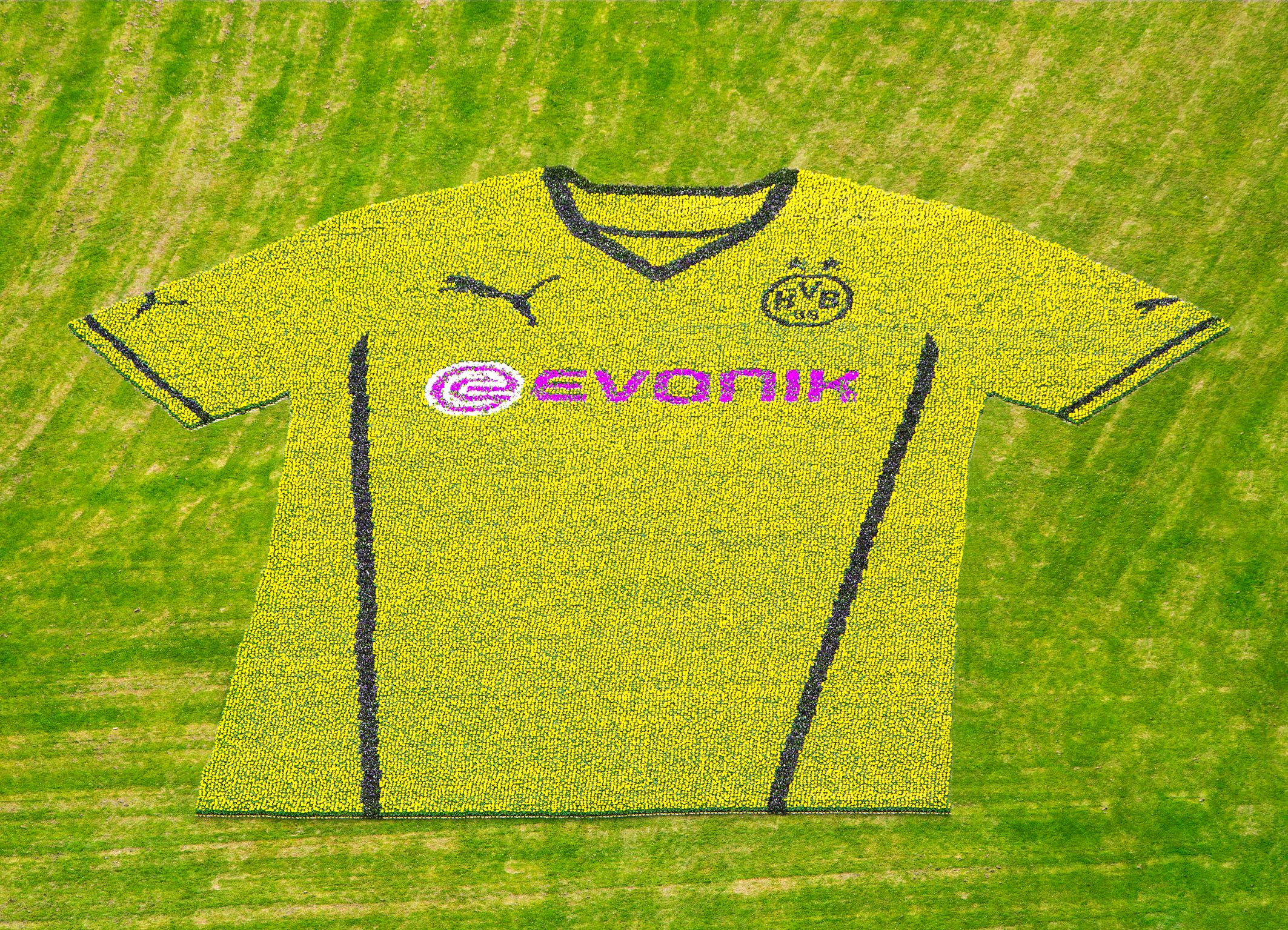 80,645 yellow flowers symbolising the average home attendance of BVB were planted, covering a huge area of a thousand square metres in the shape of the new kit, to present the new design to the public in the heart of Dortmund.