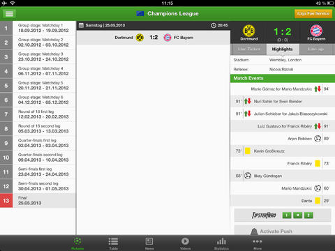 - Live statistics – team sheets, and results provided by renowned data company Opta Sports; the perfect second screen companion before, during and after the game. Data on top scorers, assists, lineups, player profiles and more is stored throughout the season; settle armchair debates here and now with a sharable, comprehensive stat pack in your pocket
