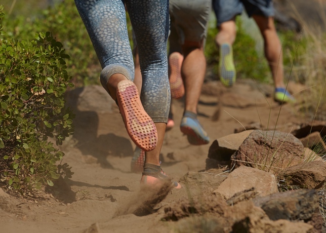 Outsole lugs are placed in an ascending pattern at the front of the shoe and a descending pattern at the back to improve grip when running up and downhill respectively. A pressure map on the Free Hyperfeel Run Trail illustrates areas where the outsole lugs are heavier for the high pressure areas.