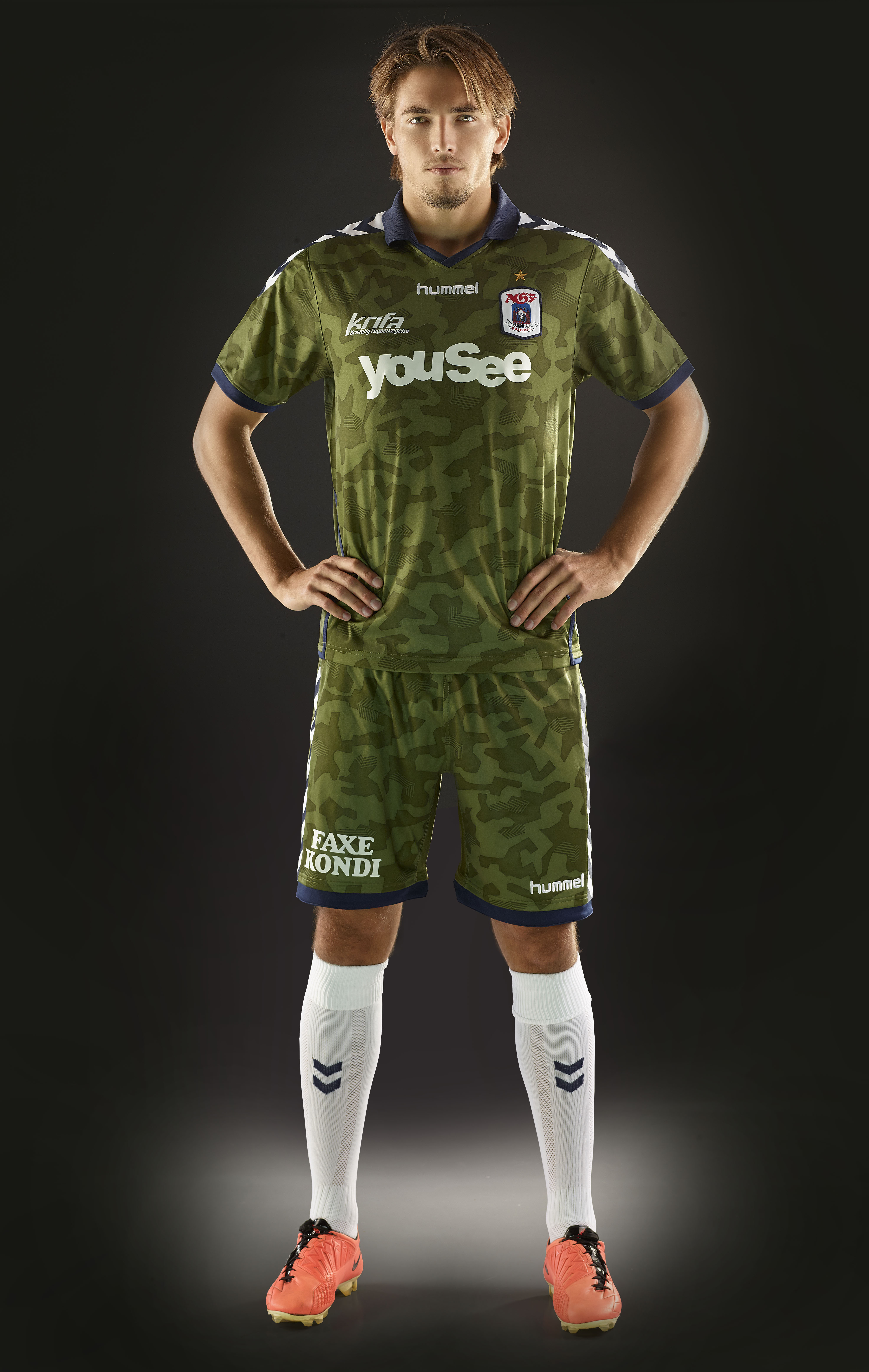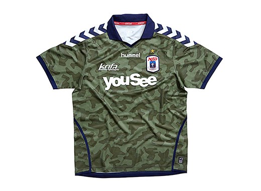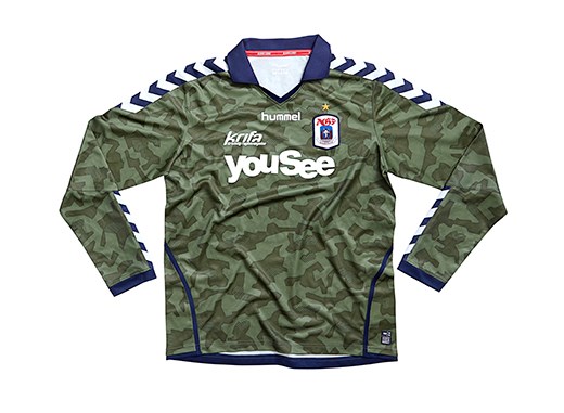 Last week AGF Aarhus returned to Blue Water Arena in Esbjerg wearing their new away kit from hummel – a green camouflage shirt with blue and white chevrons on collar and sleeves, and camouflage shorts with blue and white chevrons on the sides.