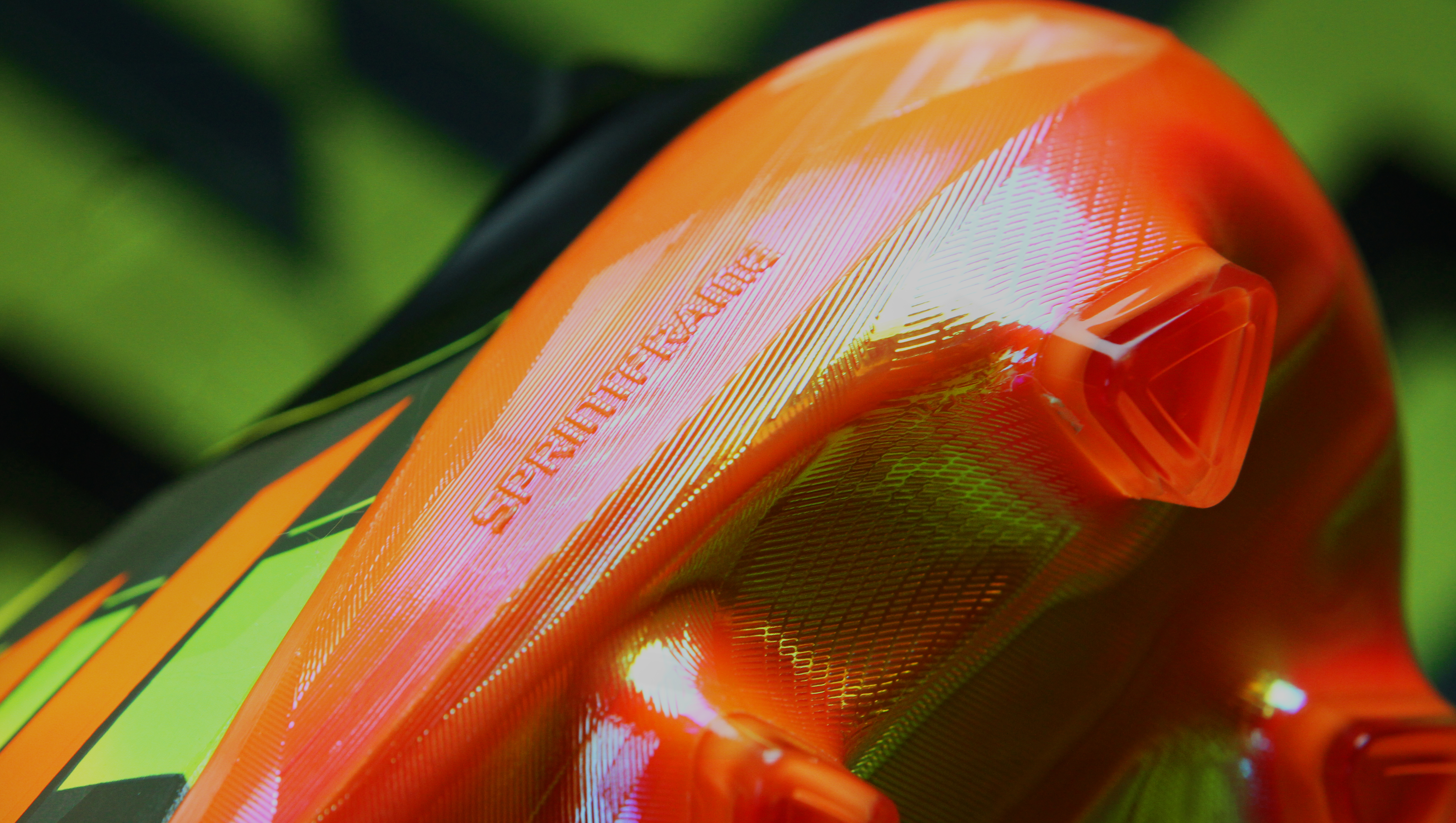 The adidas Innovation Team has developed a totally new, innovative next-generation lightweight skin which drastically reduces the weight on the upper part of the boot, while still guaranteeing high quality and performance. The sleek black and green coloured arrow design showcases the perception of forward motion, finished off with bright orange adidas three-stripes.