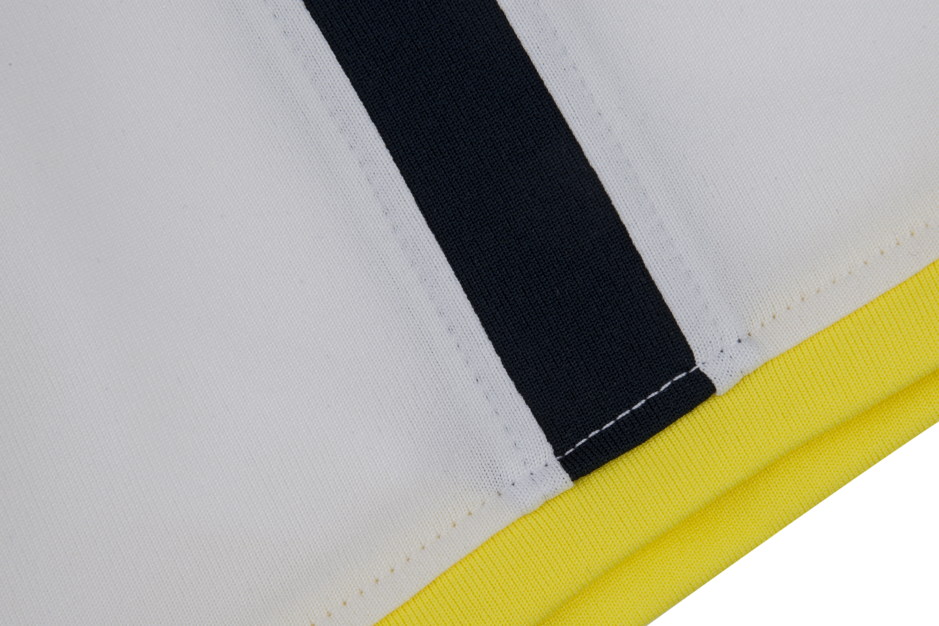 Yellow taping on the sleeve cuff and collar adds an additional colour flash to set off solid navy blue shorts and white socks.