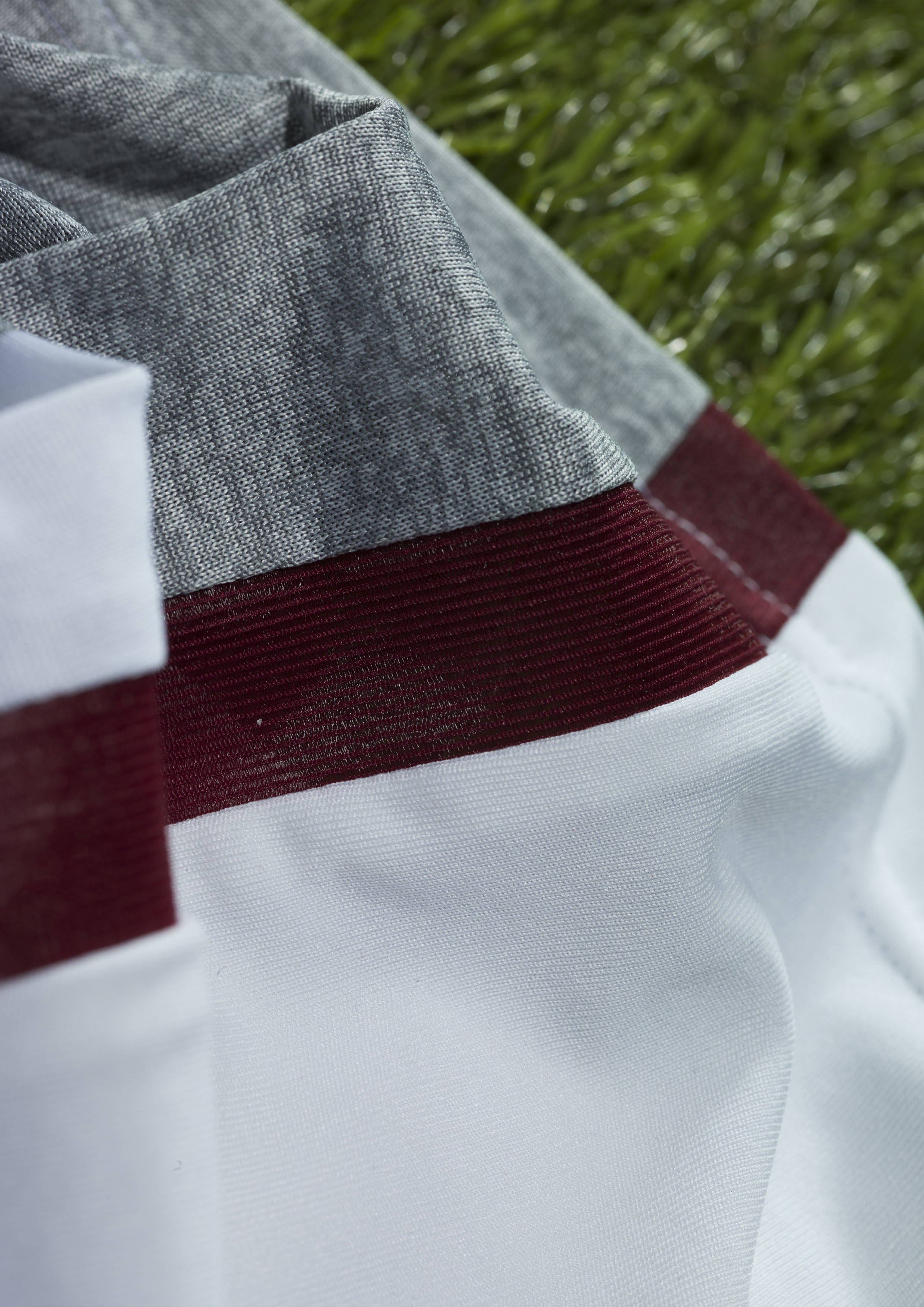 The predominantly white jersey displays an engineered front panel fabric which features three additional horizontal bands in striking iconic FCB colours – dark red, tribe blue and mid grey.