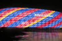 Sport-locker.net reveal that the Allianz Arena will light up for the very first time in white with a green and blue chequered “belly band” around the middle, to celebrate the Champions League Final.
